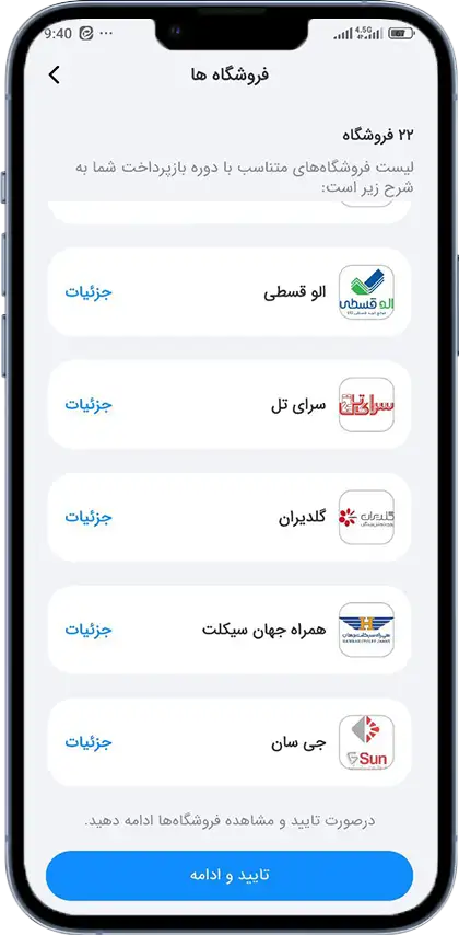 در بخش بعدی شما میتوانید لیست فروشگاه های طرف قرارداد بانک ملی در طرح کالاپی را مشاهده کنید.پس از انتخاب فروشگاه مورد نظر بر روی “تایید وادامه” کلیک کنید.