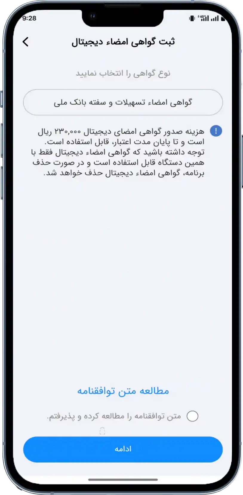 - گواهی امضای دیجیتال: علاوه بر مورد بالا، گواهی امضای دیجیتال نیز باید فعال شود. این گواهی فقط برای شخصی لازم است که چک دیجیتال به نام او صادر شده است (چه وامگیرنده باشد و چه ضامن). فعالسازی این امضا، امکان ثبت و مدیریت چک دیجیتال را بهصورت غیرحضوری فراهم میکند.