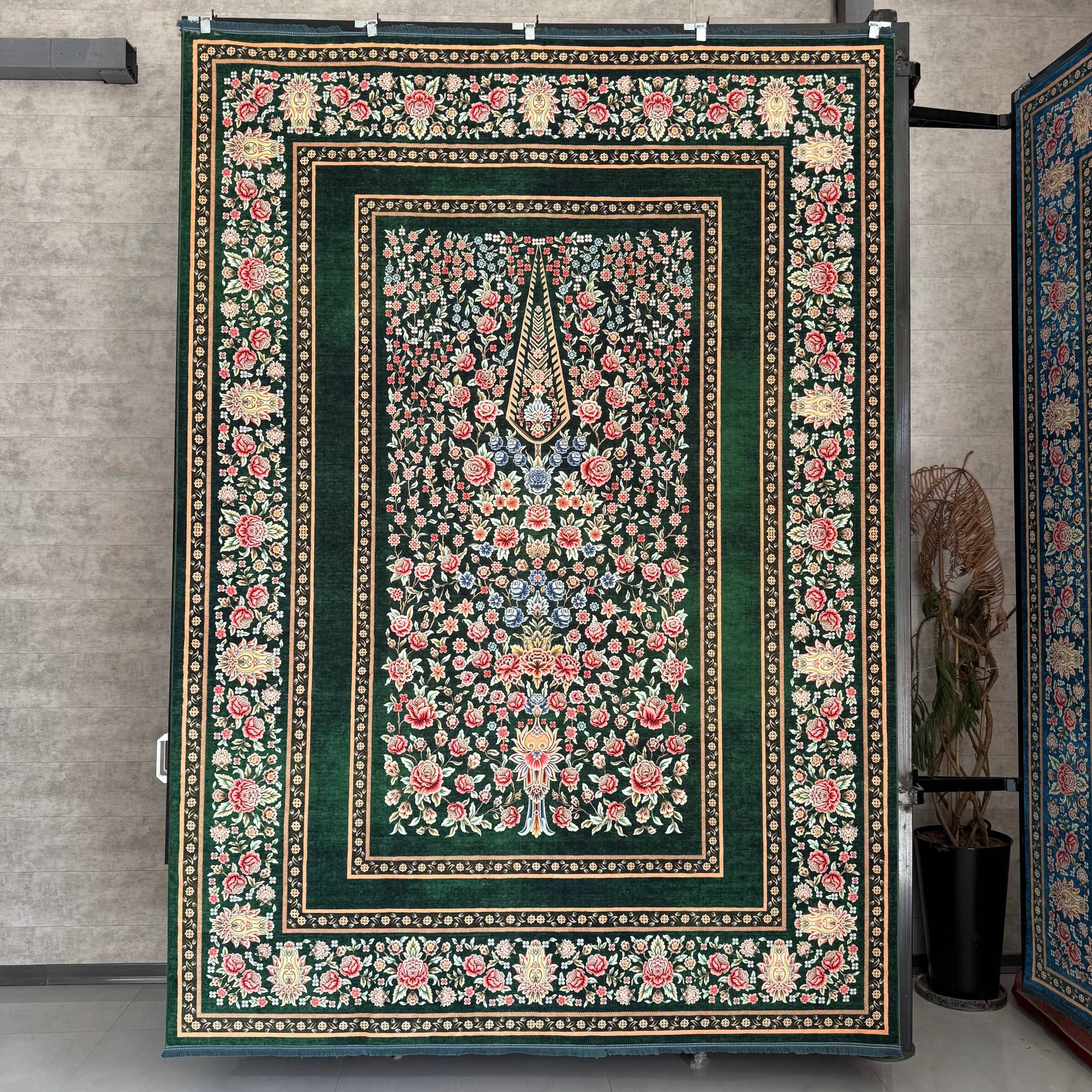 خرید فرش ابریشم نما ماشینی ۷۷ رج کد باغ گل سبز از الوقسطی