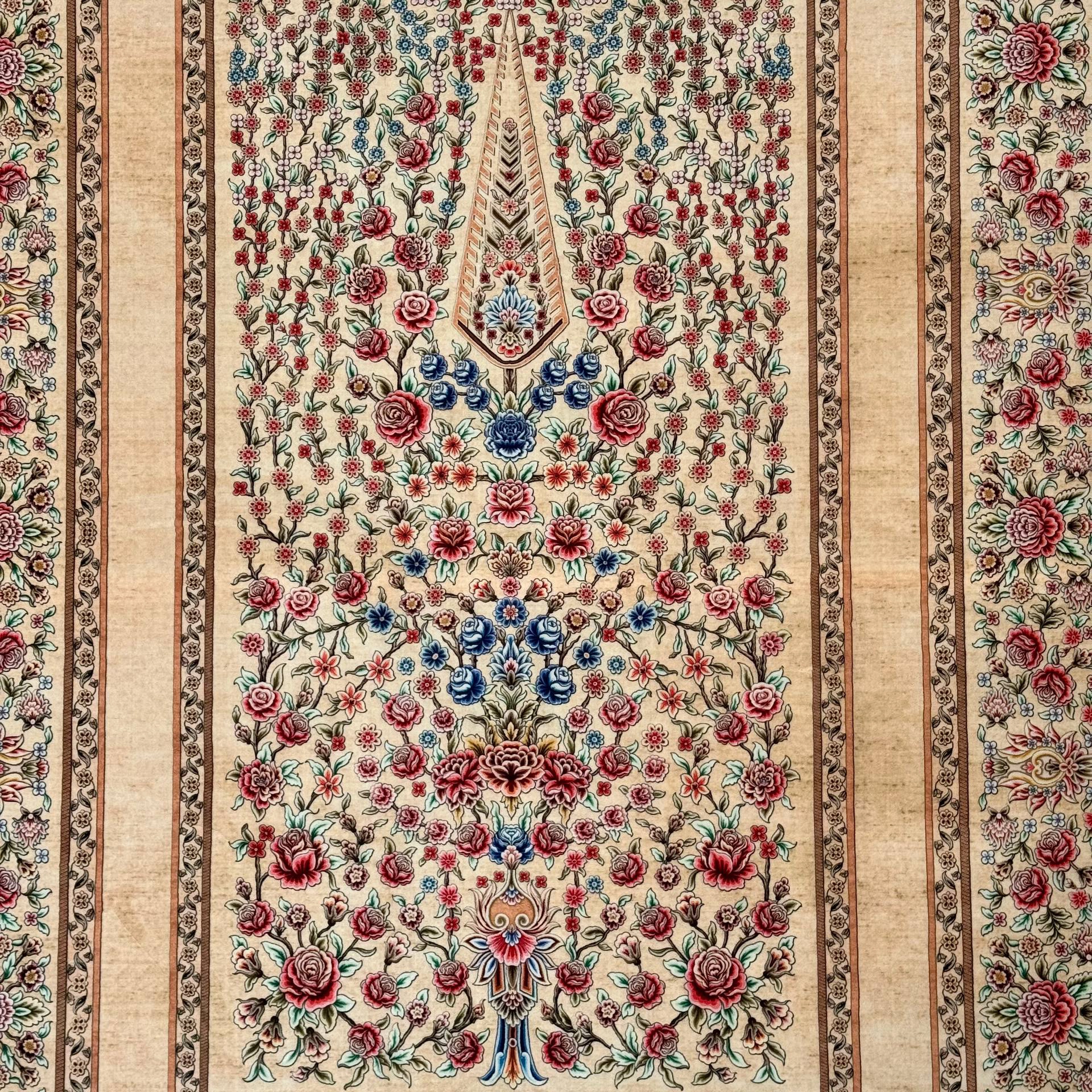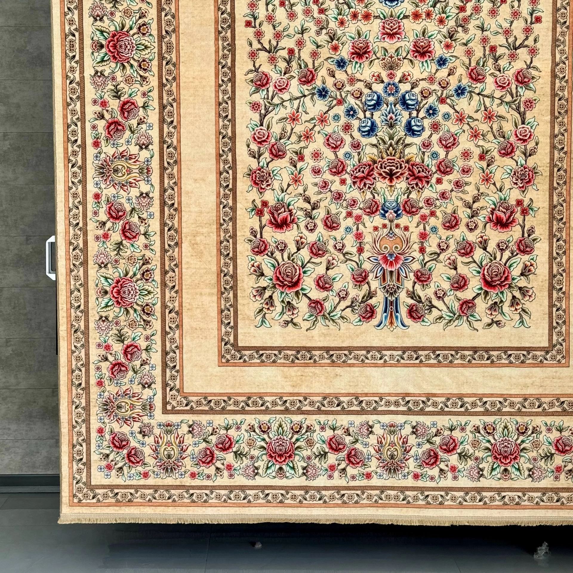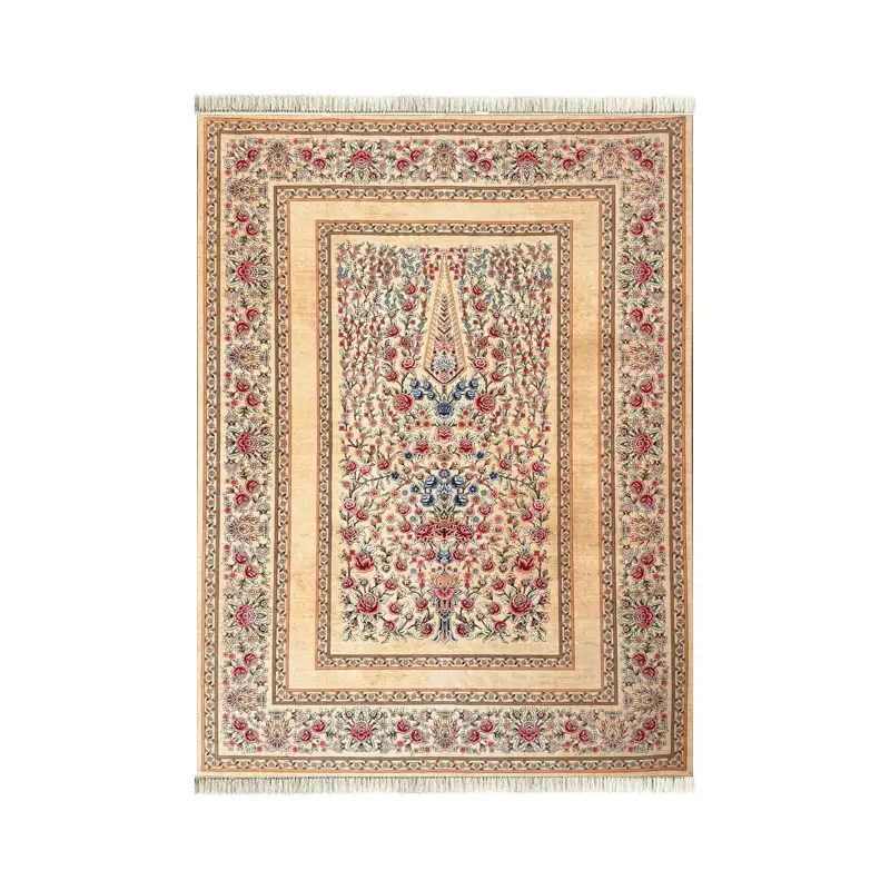 معرفی فرش ابریشم نماماشینی ۷۷ رج کد باغ گل کرم؛ تلفیقی از اصالت و ظرافت