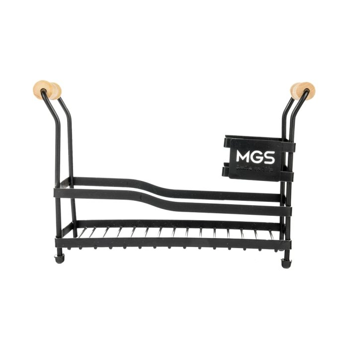 در قسمت بالایی استند، دستهی چوبی با رنگ گرم و طبیعی نصب شده تا جابهجایی و حمل آن آسان باشد. رنگ مشکی مات بدنه در کنار شفافیت شیشه، ترکیبی چشمنواز ایجاد میکند که با هر نوع دکور آشپزخانهای هماهنگ است. در واقع، اگر به دنبال تعادل بین زیبایی، دوام و نظم هستید، این مدل دقیقاً همان چیزی است که نیاز دارید.