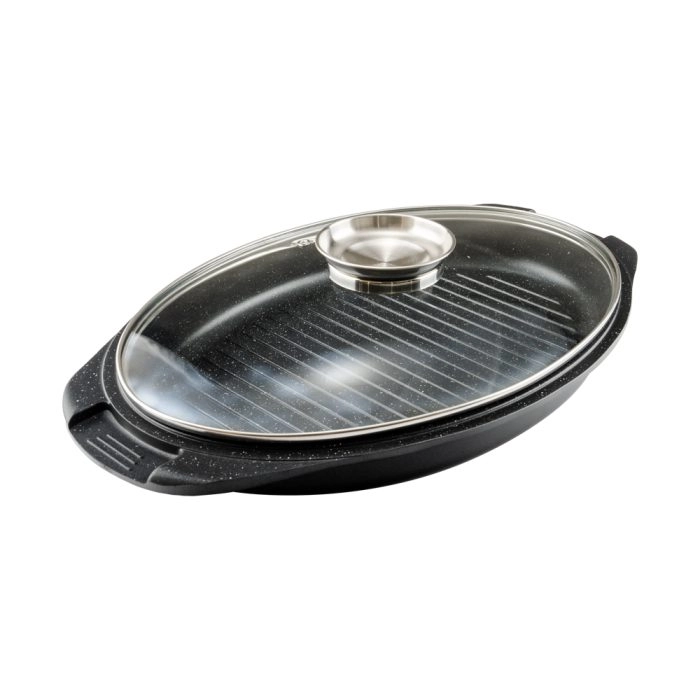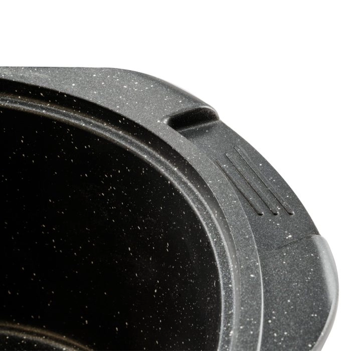 در نگاه اول، طراحی ظاهری این تابه با رنگ مشکی مات و فرم بیضیشکلش، حس حرفهای بودن را القا میکند. اما آنچه این محصول را متمایز میسازد، ترکیب هوشمندانهی آلومینیوم با روکش گرانیت و درب پیرکس مقاوم در برابر حرارت است. این تابه سهتکه شامل یک قابلمه بیضی بزرگ، یک تابه کوتاهتر و یک درب پیرکس شفاف میباشد که در کنار هم مجموعهای کامل برای طبخ انواع غذا ایجاد میکنند.