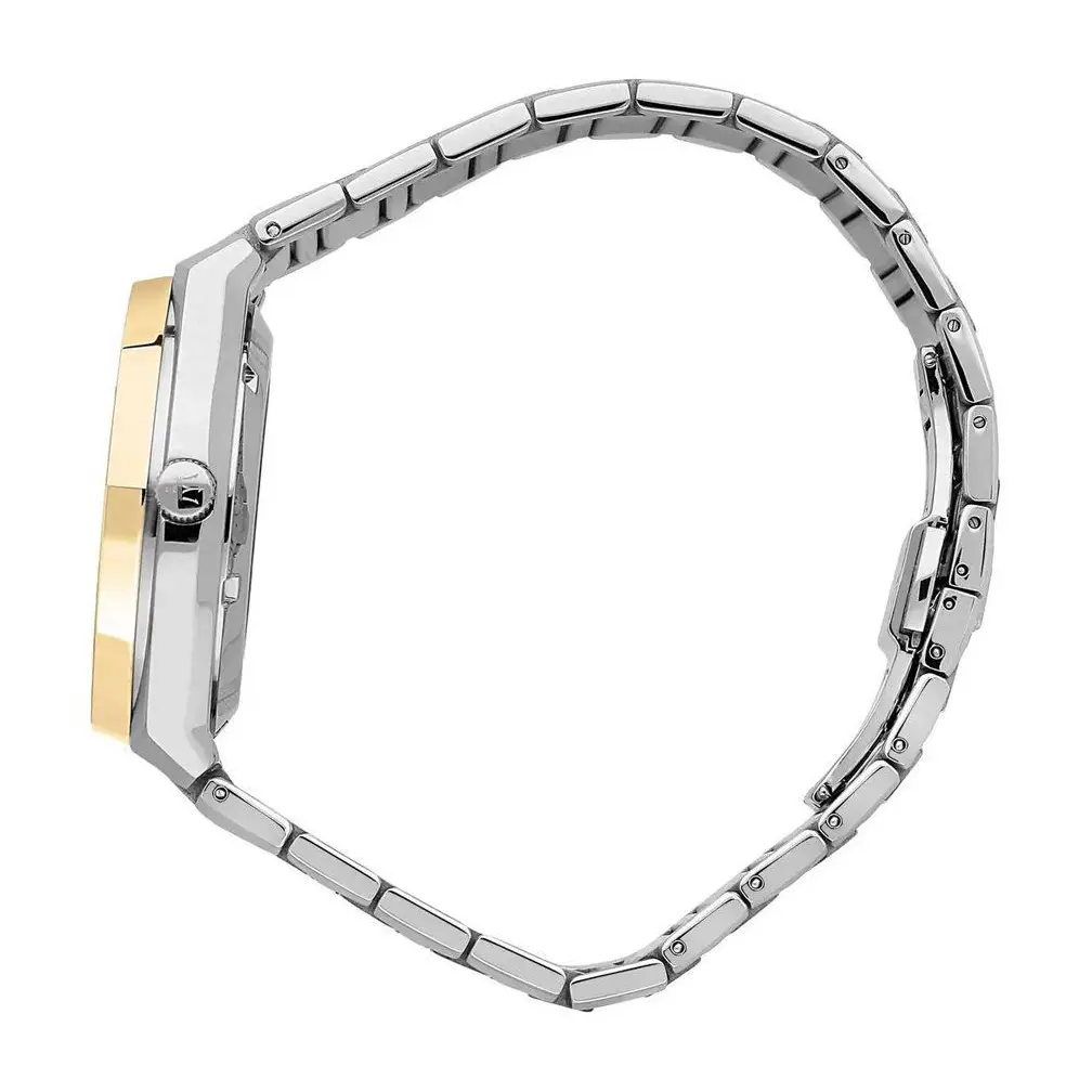 آنچه این مدل را از دیگر ساعتهای مشابه متمایز میکند، بیشک طراحی رنگی چشمگیر آن است. استفاده از رنگ نقرهای و طلایی در بدنه و بند، حس لوکس بودن را در نگاه اول القا میکند. در عین حال، صفحه سرمهای تضاد زیبایی با این ترکیب ایجاد کرده که جلوه بصری آن را دوچندان میسازد.