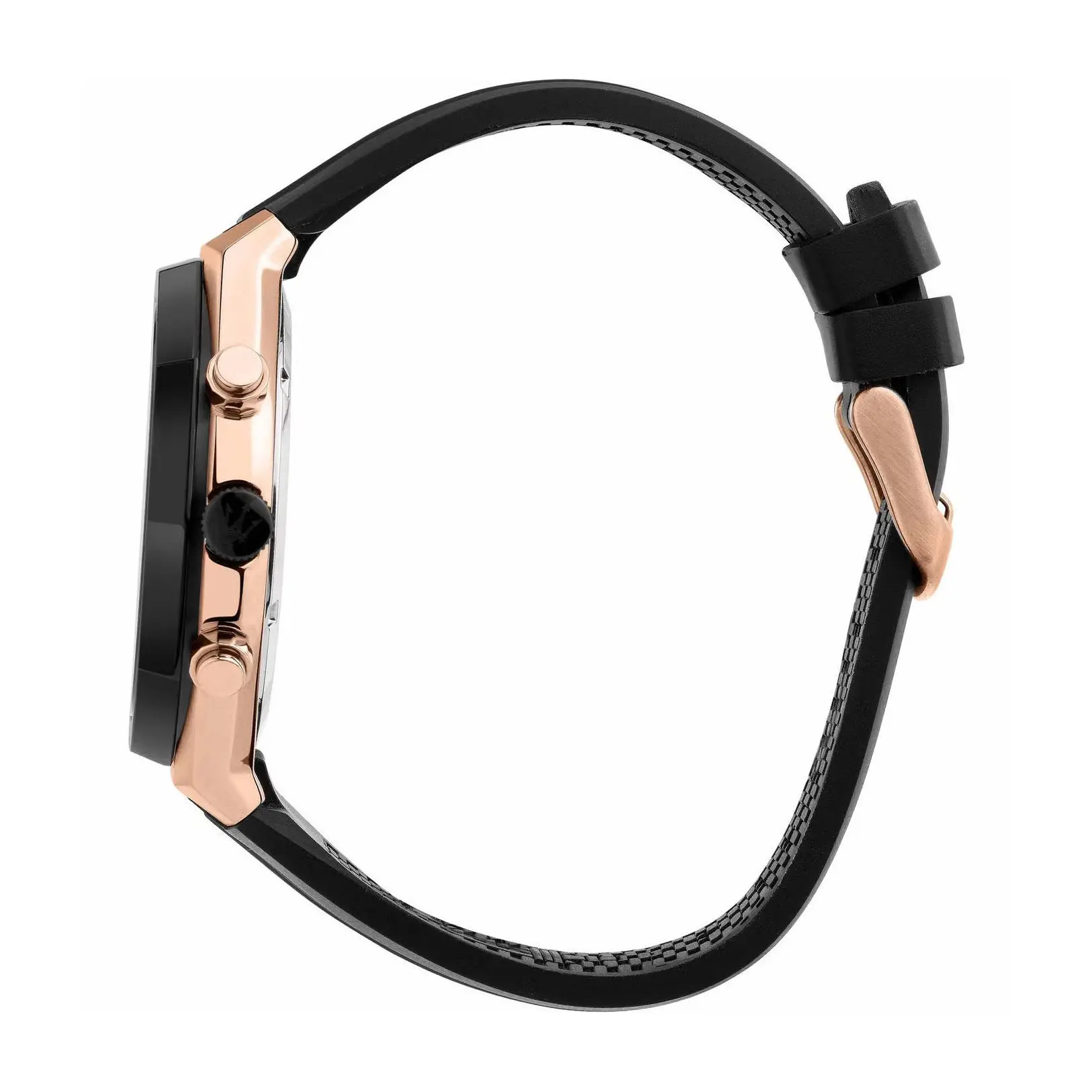 در نگاه اول، ترکیب رنگ رزگلد و مشکی بدنه در کنار صفحه شفاف با رنگهای نقرهای و مشکی، زیبایی خیرهکنندهای را القا میکند. این ساعت با قاب گرد ۴۵ میلیمتری و بند مشکی رزینی، حس مدرن بودن را با راحتی استفاده تلفیق کرده است. در عین حال، با استفاده از شیشه کریستال یاقوت کبود، مقاومت و دوام آن به سطحی بسیار بالا رسیده است. ویژگیهای کلیدی این ساعت شامل: