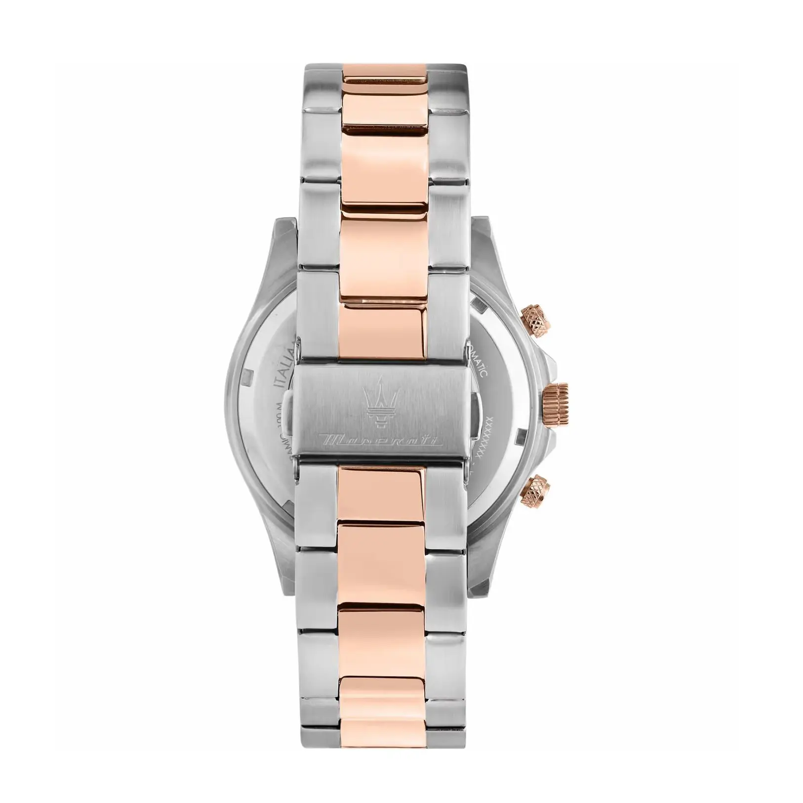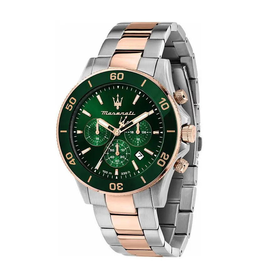 در این مدل، مازراتی با حفظ طراحی کلاسیک صفحه گرد، نوآوری خاصی در رنگبندی و جزئیات بهکار گرفته است. بدنه و بند از استیل ضد زنگ با ترکیبی از رزگلد و نقرهای ساخته شدهاند، در حالی که صفحه سبز رنگ ساعت، حس طراوت، اصالت و قدرت را بهخوبی منتقل میکند. قطر قاب ۴۳ میلیمتری، تناسبی عالی با مچ دست ایجاد کرده و ظاهری متعادل و قابلتوجه به ساعت میدهد. ویژگیهای مهم این مدل عبارتند از: