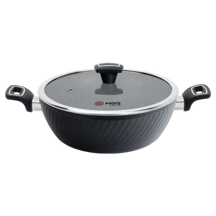 برای پخت غذاهای حجیم و حتی سرو دستهجمعی، تابه سایز ۲۸ دو دسته طرح فورج سری پنج از برند MGS گزینهای ایدهآل است. این تابه با قطر ۲۸ سانتیمتر و بدنه آلومینیومی، حرارت را یکنواخت منتقل میکند و مانع چسبیدن غذا به کف ظرف میشود. درب تخت پیرکس با سوپاپ اطمینان امکان مشاهده روند پخت را بدون باز کردن در فراهم میکند و میتوان از آن برای برگرداندن غذا نیز استفاده کرد. اگر قصد خرید تابه گرانیتی دارید، این مدل با دوام و طراحی کاربردی، انتخابی مطمئن برای آشپزی روزمره و مهمانیهاست.