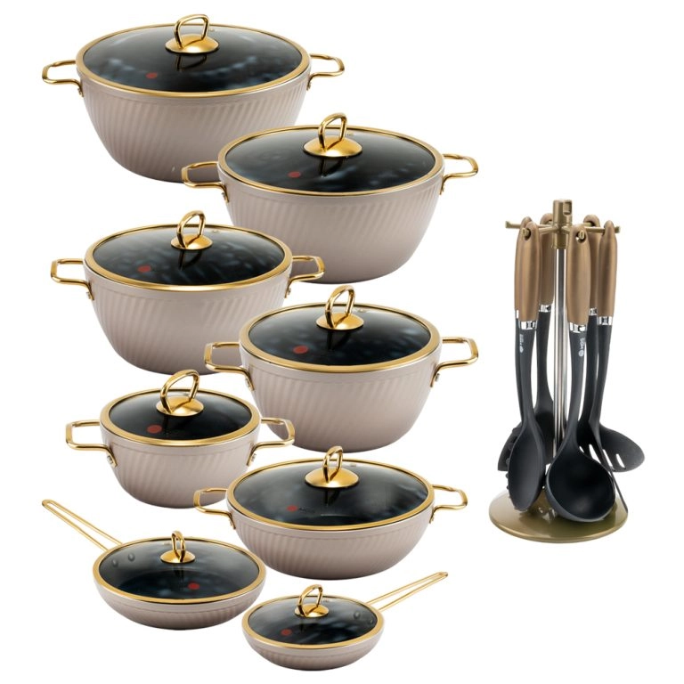 این سرویس برای افرادی طراحی شده که هم زیبایی و هم کارایی را در آشپزخانه خود میخواهند. مجموعه شامل پنج قابلمه در سایزهای مختلف، سه تابه و یک ست کفگیر و ملاقه هفت پارچه است تا برای هر نوع غذای ایرانی و بینالمللی قابل استفاده باشد.