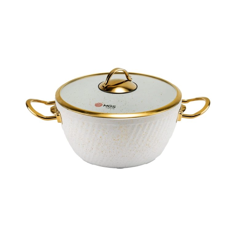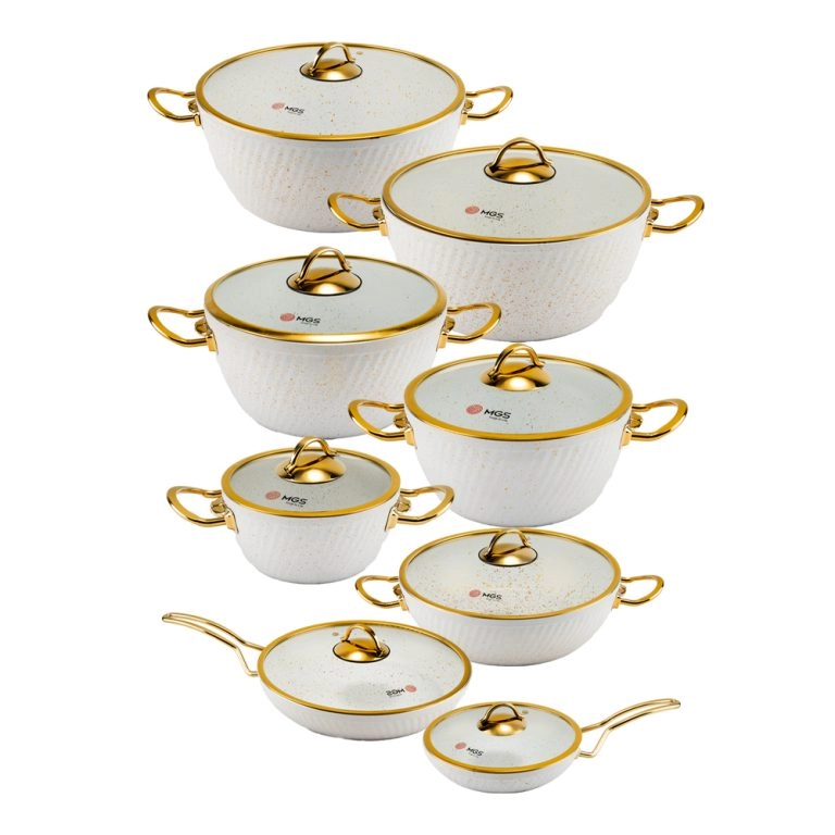 این سرویس شامل پنج قابلمه با قطرهای ۱۶، ۲۰، ۲۴، ۲۸ و ۳۲ سانتیمتر، یک تابه دو دسته سایز ۲۸ و دو تابه تک دسته سایز ۲۰ و ۲۸ سانتیمتر همراه با دربهای پیرکس مقاوم است. بدنهی آلومینیومی با روکش گرانیت، مقاومت بالا در برابر حرارت و ساییدگی دارد و سطح نچسب آن، پخت و سرو غذا را آسان میکند.
