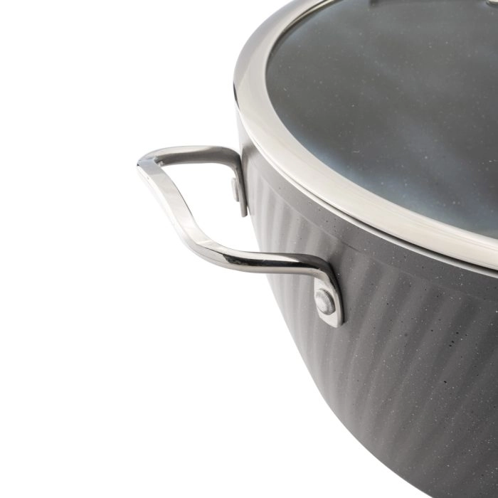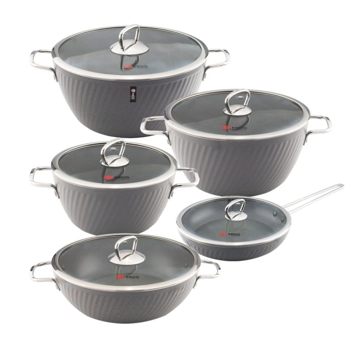 این سرویس قابلمه ۱۰ پارچه با طراحی دقیق و استفاده از تکنولوژی فورج، مقاومت بالایی در برابر فشار و وزن ارائه میدهد. دستههای متصل به بدنه از جنس آلومینیوم، جابجایی قابلمهها و تابهها را ایمن و راحت میکنند. روکش گرانیت نچسب، آشپزی بدون دردسر و تمیز کردن سریع قابلمهها را ممکن میسازد. مشخصات اصلی سرویس قابلمه عبارتاند از:
