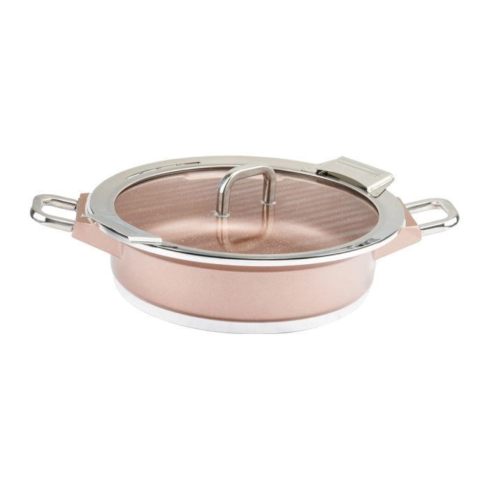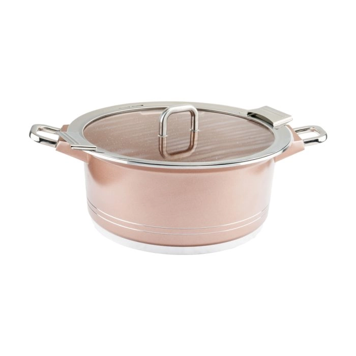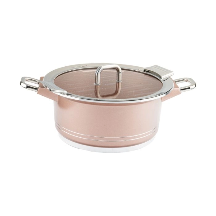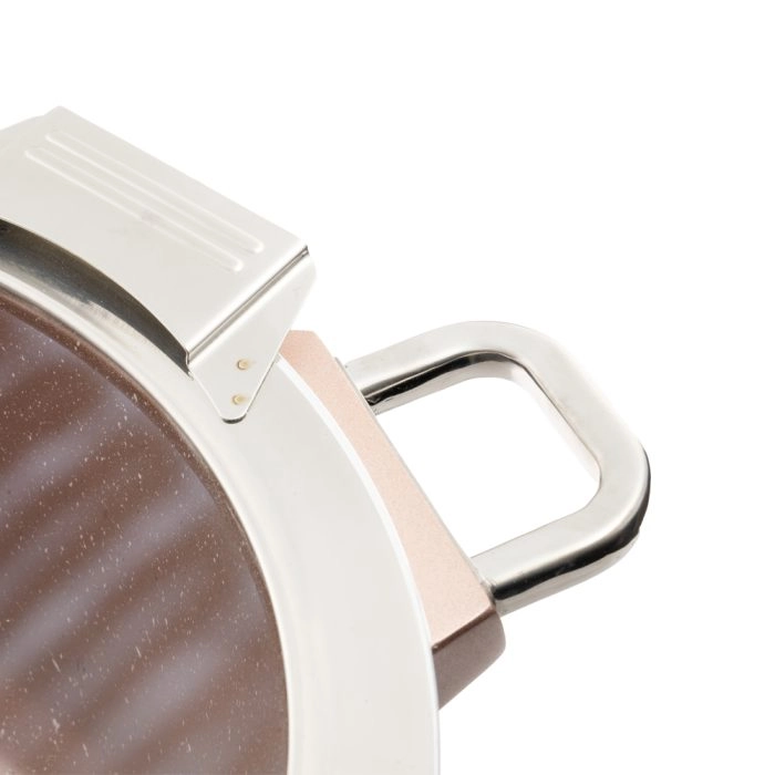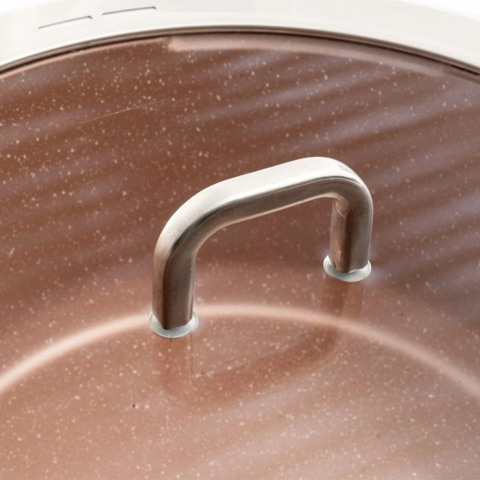 این سرویس قابلمه با تکنولوژی دایکست ساخته شده و دستههای آن از جنس بدنه متصل شدهاند تا مقاومت بیشتری در برابر فشار و وزن ارائه دهند. روکش گرانیت نچسب، پخت سریع و تمیز کردن آسان را ممکن میسازد. طراحی مدرن و رنگ کرم ماربلو رزگلد، جلوهای شیک و هماهنگ با هر آشپزخانه ایجاد میکند. مشخصات اصلی سرویس قابلمه عبارتاند از:
