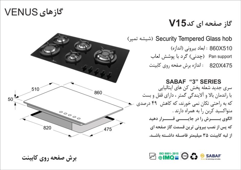 لحاظ شود که اجاق گاز صفحهای اخوان مدل V15 دارای ابعادی به طول ۸۶ سانتیمتر و عرض ۵۱ سانتیمتر میباشد. همچنین الگوی برش برای این مدل ابعادی به اندازه ۸۲ سانتیمتر در ۴۷.۵ سانتیمتر دارد.