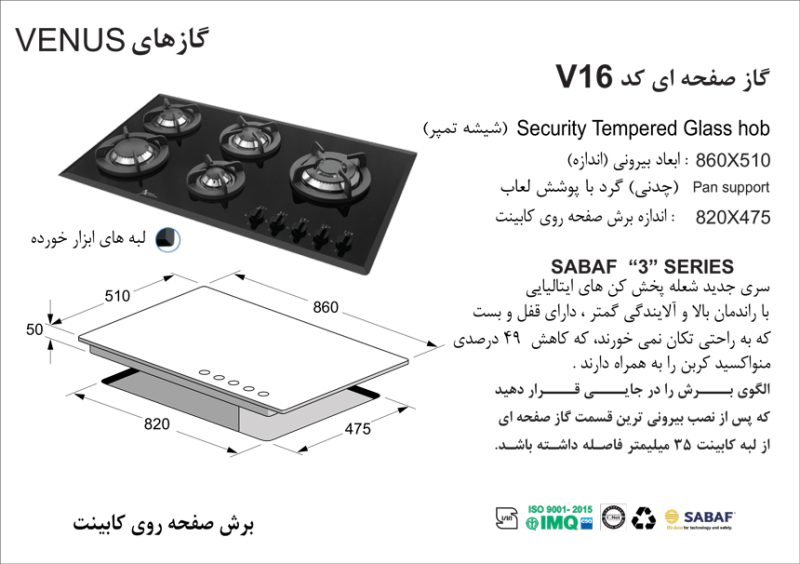 لحاظ شود که اجاق گاز صفحهای اخوان مدل V15 دارای ابعادی به طول ۸۶ سانتیمتر و عرض ۵۱ سانتیمتر میباشد. همچنین الگوی برش برای این مدل ابعادی به اندازه ۸۲ سانتیمتر در ۴۷.۵ سانتیمتر دارد.
