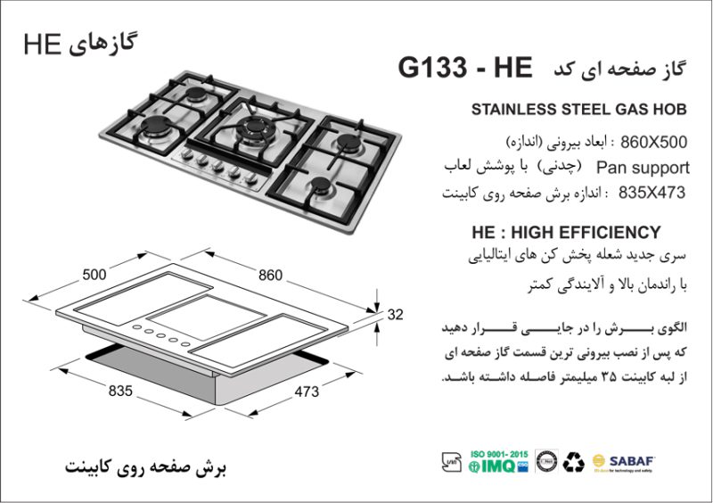 ابعاد این محصول به طول ۸۶ سانتیمتر و عرض ۵۰ سانتیمتر است. همچنین، الگوی برش برای نصب این مدل گاز ۸۳.۵ سانتیمتر در ۴۷.۳ سانتیمتر تعیین شده است. محل قرارگیری ولوم ها بصورت تخت میباشد.