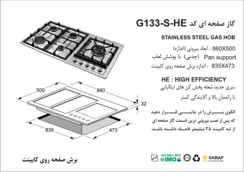 ابعاد این محصول به طول ۸۶ سانتیمتر و عرض ۵۰ سانتیمتر است. همچنین، الگوی برش برای نصب این مدل گاز ۸۳.۵ سانتیمتر در ۴۷.۳ سانتیمتر تعیین شده است. نوع ولوم ها بصورت تخت میباشد.