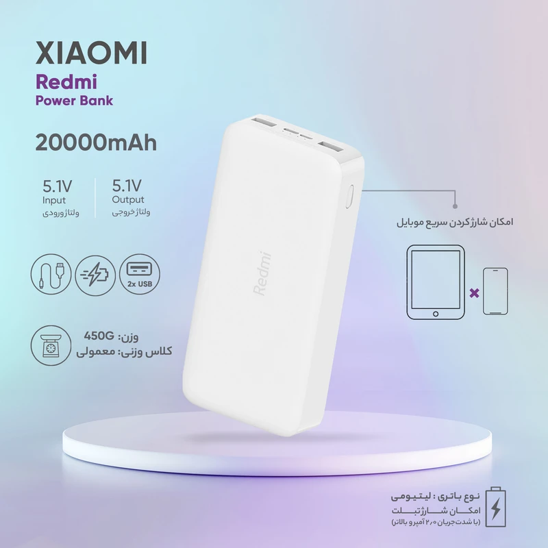 معرفی پاوربانک شیائومی مدل Redmi ظرفیت ۲۰۰۰۰ میلی آمپرساعت